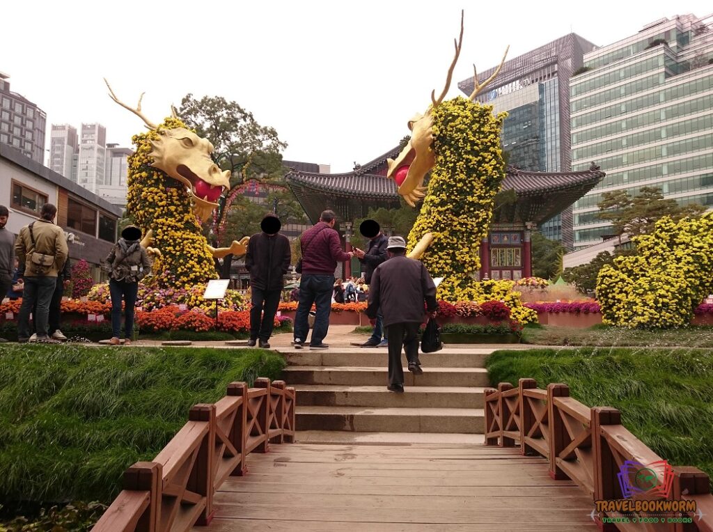 On our way, I saw a strange-looking tree with lots of yellow flowers in front of Jogyesa temple. It was a diversion from my original plan, but I couldn’t ignore it, so I stopped by for a visit. But It was worth it, the temple was surrounded by beautiful flowers and two dragons were guarding the place, both covered with flowers.