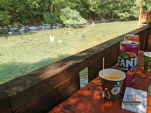 On the way back, we tried the pizzeria, but it was closed, and the zipline office was empty. Luckily, Umi Bardhe was open, so we stopped for a riverside break. Many swans gathered in the clear water and occasionally squabbled over territory, which made the place a little noisy.