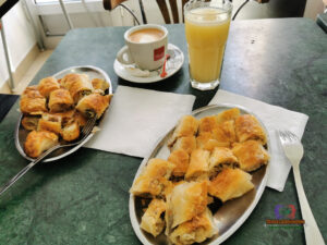 - Merak Cafe: Mike had a macchiato, and I tried boza for the first time, and I loved it. Boza is a traditional, non‑alcoholic (or very low‑alcohol) drink made from fermented cereals such as corn, wheat, or millet, and my favourite was the corn version. We also shared two portions of meat, spinach, and cabbage burek, and the total cost was only €4.50.